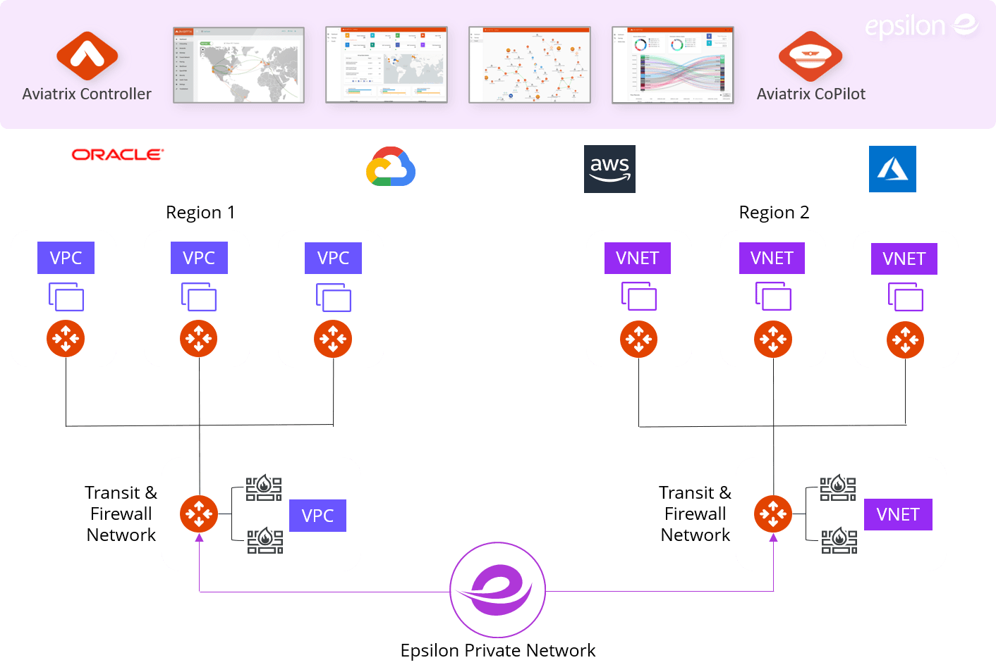 Cloud Networking combines Epsilon’s private network and an unparalleled cloud network platform to create an enterprise-class network inside and between public clouds, up to the VPC/VNET level.